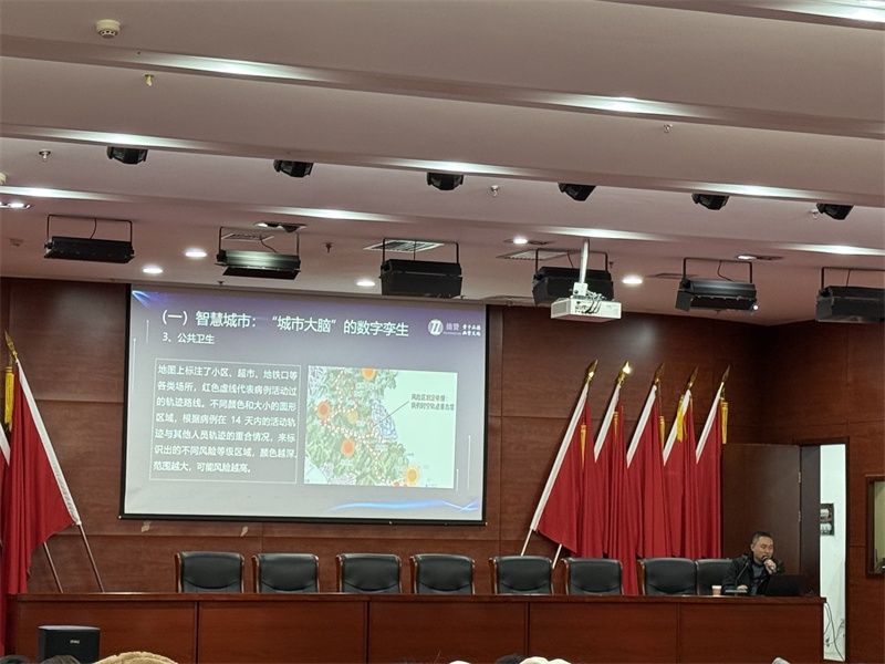韩晓庆专家首先以智慧城市中的“城市大脑”数字孪生系统为例,深入讲解了其在公共卫生领域的精细化管控能力。通过一张实时动态地图,他展示了如何利用空间信息技术,精准标注小区、超市、地铁站等各类场所,并利用红色虚线清晰追溯病例的活动轨迹。更引人注目的是,系统能根据轨迹重合分析,自动生成不同颜色与大小的风险预警区域。“颜色越深、范围越大,代表潜在风险越高,”韩晓庆解释道,“这项技术为疫情流调、风险分区和精准防控提供了至关重要的决策依据,是数字技术守护城市安全的前沿实践。”