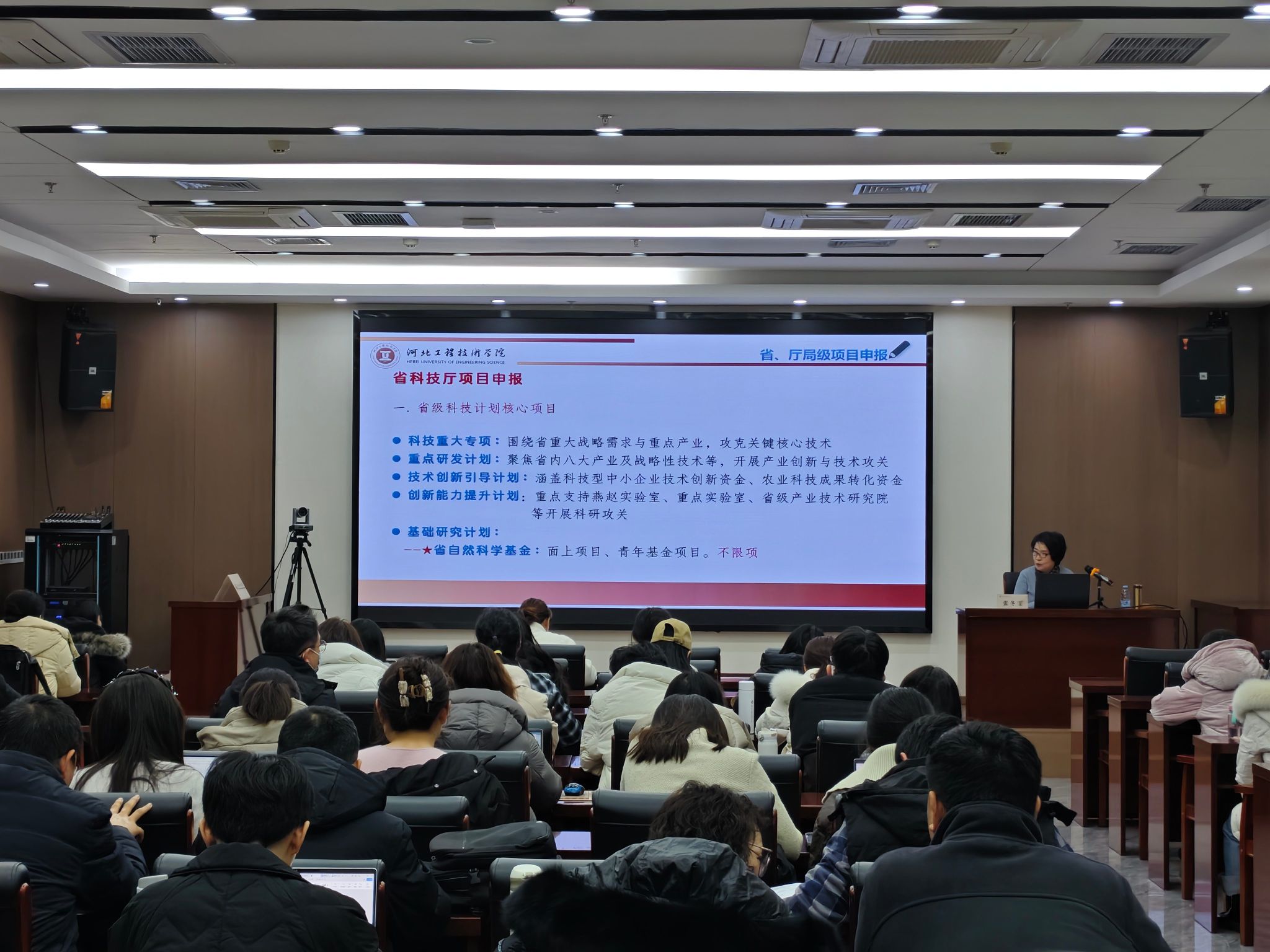 随后,张教授围绕省厅局级项目申报、企业委托与开放性项目、国家自然科学基金等核心内容展开详细讲解。在省厅局级项目申报板块,她分别介绍了省科技厅、省教育厅、石家庄市科技局三类项目的申报要点:省科技厅项目涵盖科技重大专项、重点研发计划等核心项目及国际科技合作计划、软科学研究计划等专项类项目,明确了 3 月、7 月、10-11 月等关键申报指南发布时间;省教育厅项目分为科研类与教研教改类,其中科研类包括青年拔尖人才项目、青年基金项目等,教研教改类项目已公布 2025 年立项结果,学校多项课题获批;石家庄市科技局项目则聚焦产学研合作,基础研究专项单个资助 5-10 万元,需与域内企业合作申报。