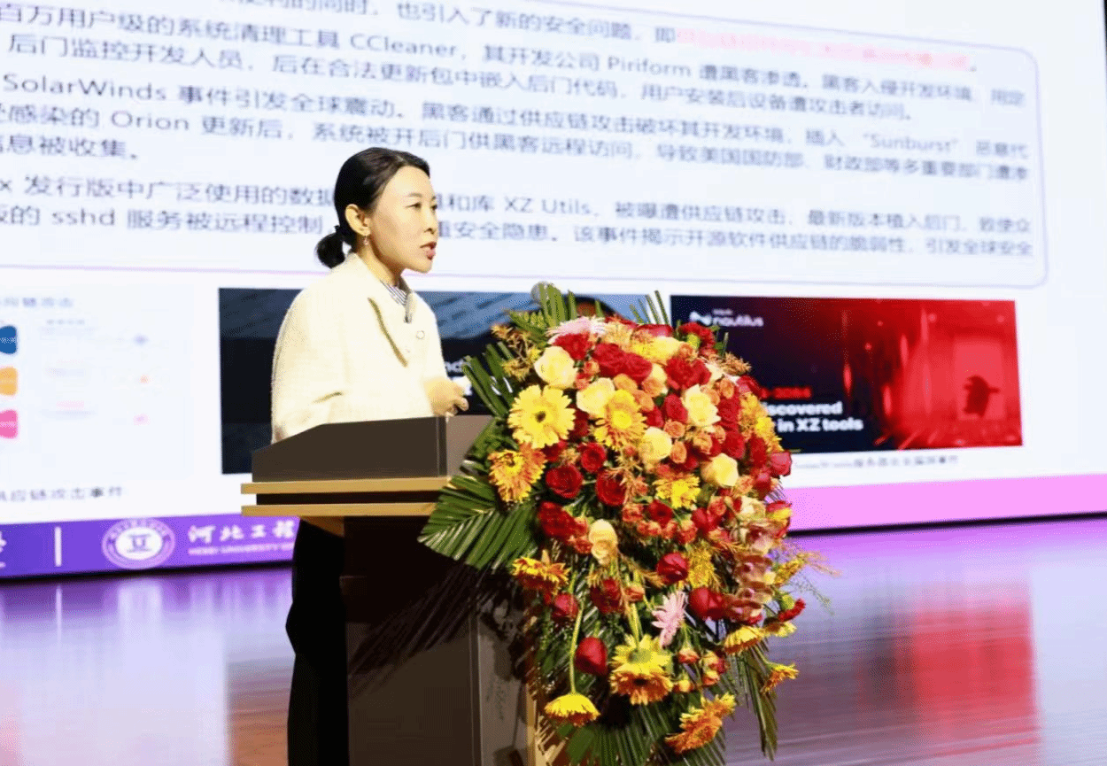 讲座伊始,张波副院长代表学院对邢颖副教授的到来表示热烈欢迎,并详细介绍了其学术背景与研究成就。张波副院长指出,邢颖副教授作为CCF高级会员、博士生导师、国家自然科学基金同行评议专家及行业学术论坛核心组织者,长期深耕软件工程与智能安全领域,成果丰硕。她强调,在AI技术快速迭代的背景下,安全知识图谱已成为网络威胁感知、风险预警的核心支撑,其自动构建与推理技术的研究具有重要学术价值和产业应用前景,希望通过此次讲座为教师搭建学术交流平台,助力教学科研工作提质增效。