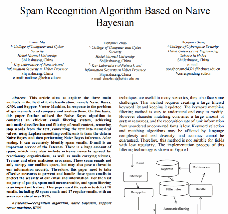 近日,2025年第八届计算机网络、电子与自动化国际会议顺利召开。河北工程技术学院网络空间安全学院宋红梅老师携《Spam Recognition Algorithm Based on Naive Bayesian》(基于朴素贝叶斯的垃圾邮件识别算法)研究论文受邀参会并作专题报告,成果获与会专家关注与认可。