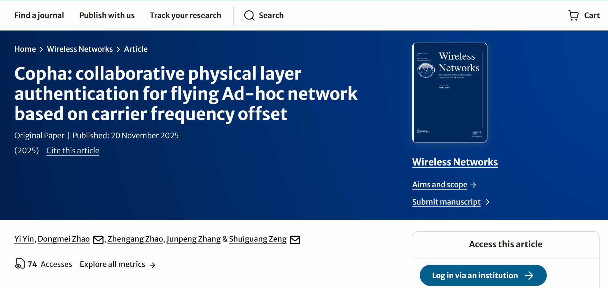 近日,河北工程技术学院网络空间安全学院专任教师尹伊,在无线网络安全领域研究取得重要进展。其题为《Copha: collaborative physical layer authentication for flying Ad-hoc network based on carrier frequency offset》的学术论文成功发表于国际知名期刊《Wireless Networks》(ISSN:1022-0038),为飞行自组网安全认证技术创新提供了全新解决方案。