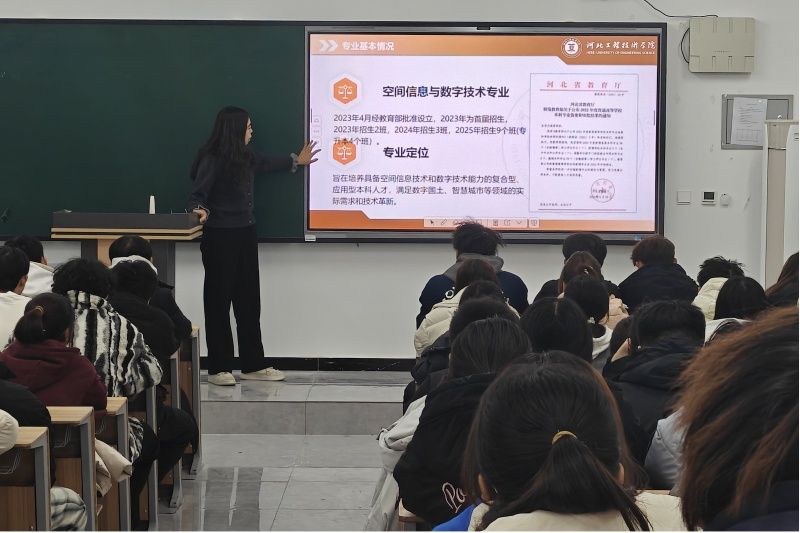 为进一步明确专业学习方向,科学规划大学四年学习生活,2025年11月25日下午,空间信息与数字技术专业2025级全体学生于河北工程技术学院教7-202参加了由系主任韩冰老师主讲的“空间信息与数字技术专业介绍”专题讲座。